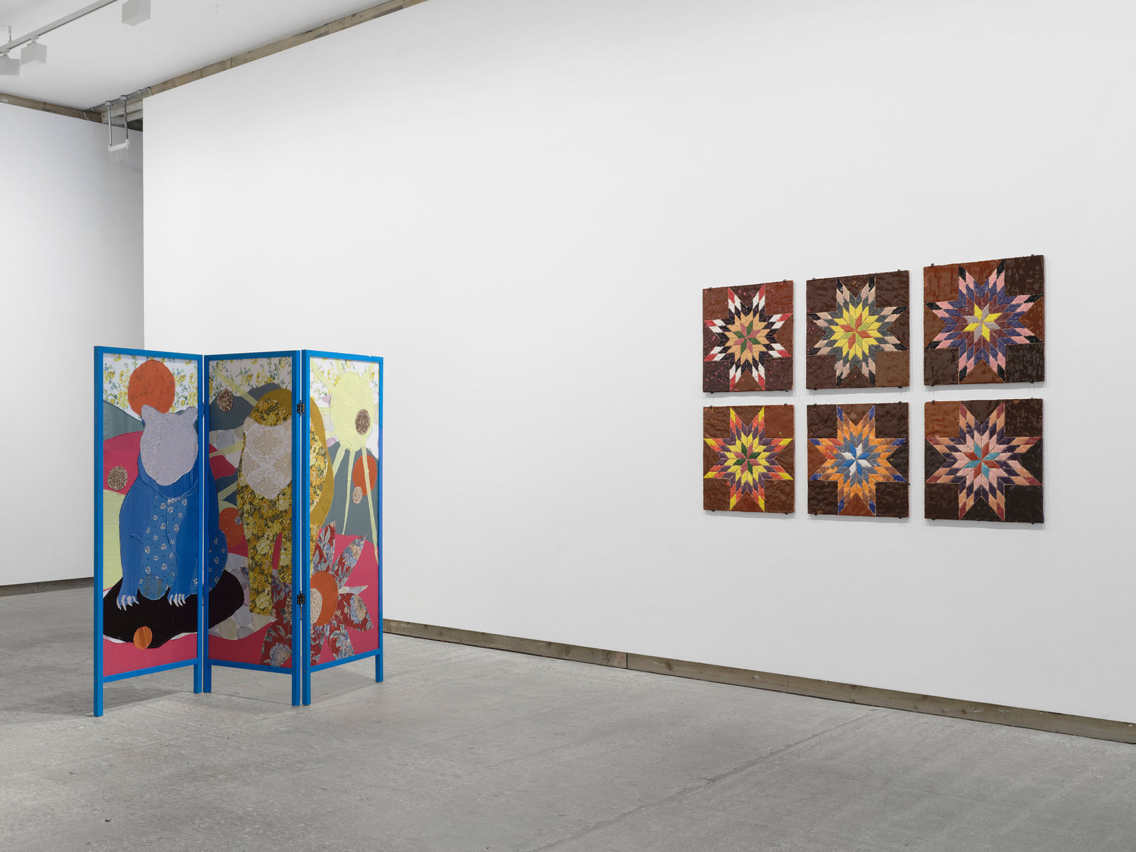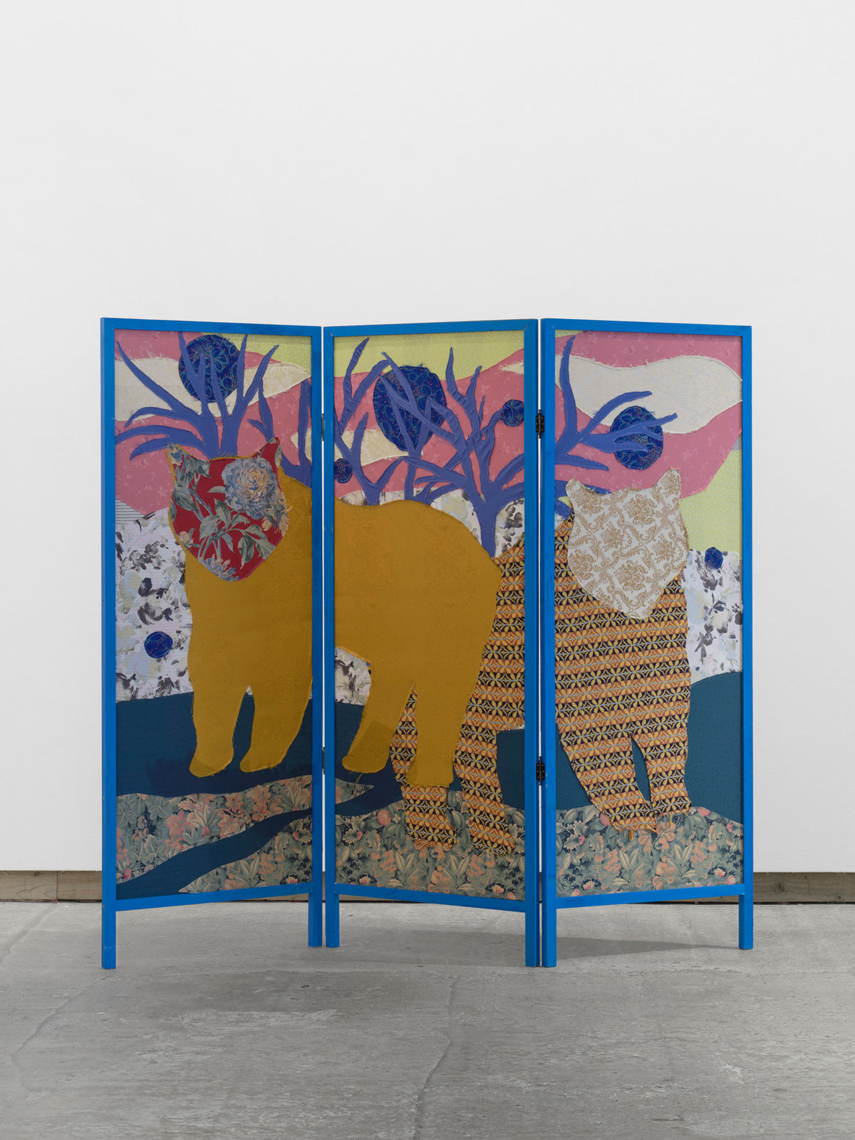 Textile, mixed media on canvas, on wooden board, wooden screen