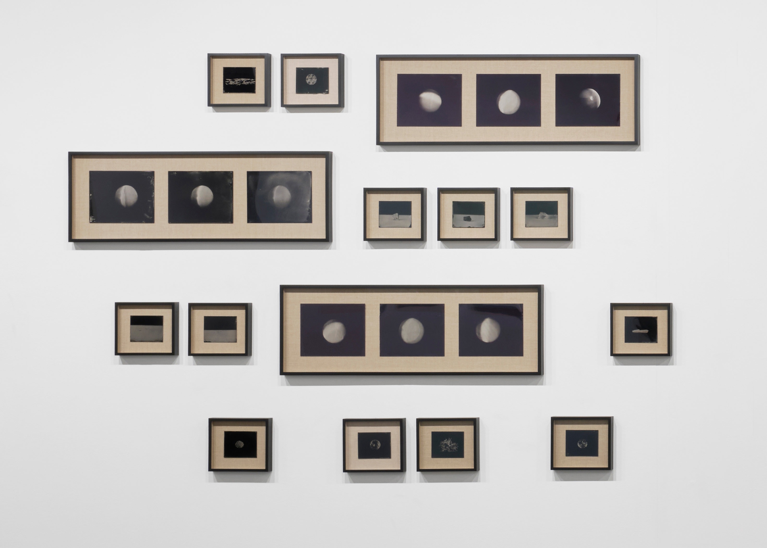 For the series Objects in Space (2019-22) and Silver Moons (2022), Smith worked with tintype photographer Nicky Thompson to produce a set of small, postcard-sized ambrotypes and tintypes, processes developed in the 1850s as a more affordable alternative to daguerreotypes. Objects in Space capture and document certain natural objects, recalling still unknown realms such as the depths of the ocean or outer space. Despite their antiquated mode of production, the dense dark background brings to mind the liquid-crystal display screen of a mobile phone – a device that people receive most of their images on today.
